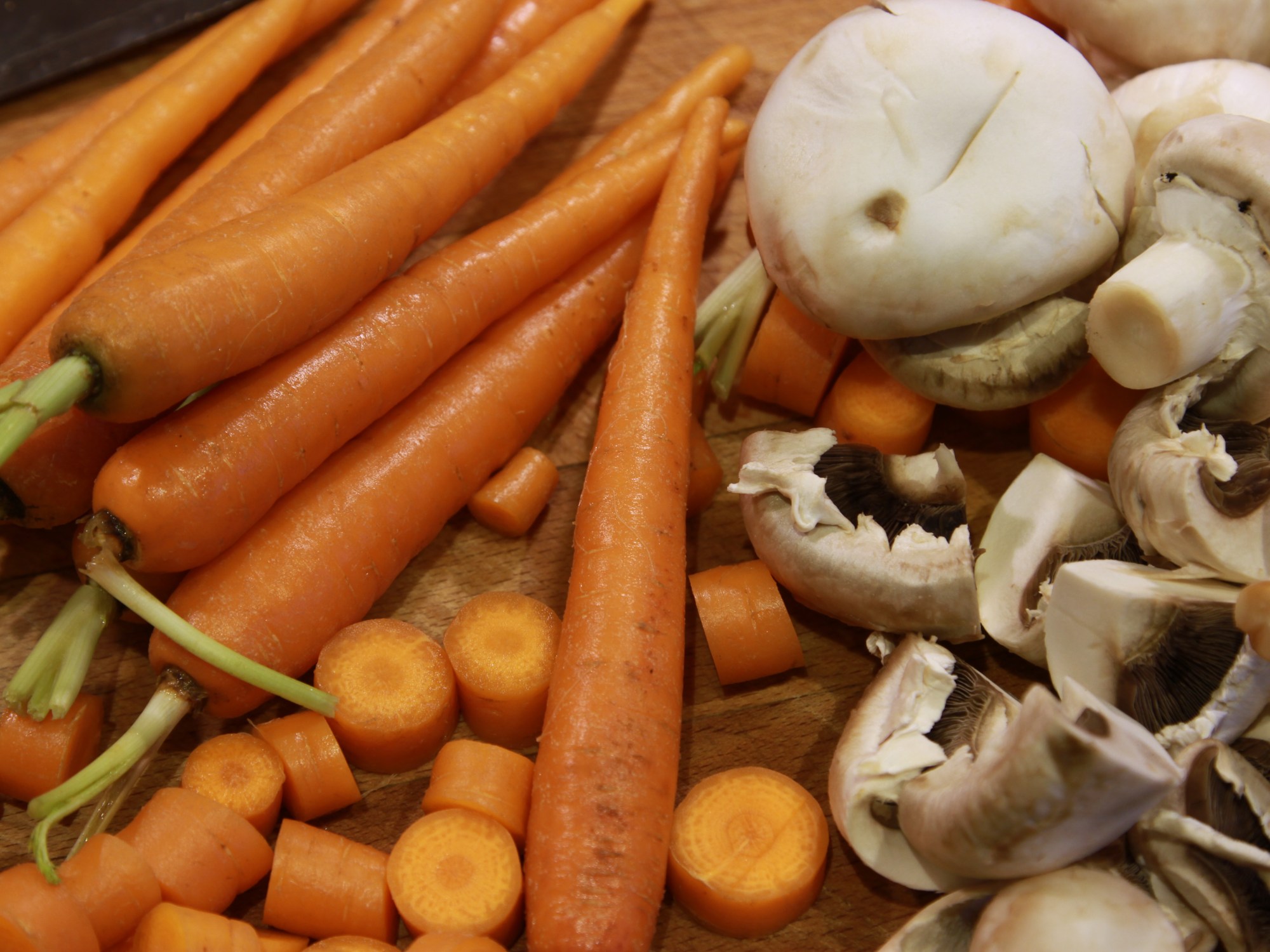 Next add the mushrooms. Keep turning it over every few mins and the mushrooms which will have almost completely filled the pot initially, will reduce down to less than a quarter of their original volume. A lot of liquid will start to come out of the mushrooms. At this point add the carrots and the potatoes. Keep the heat low and allow it all to simmer – add a little water or chicken stock if it begins to dry out.