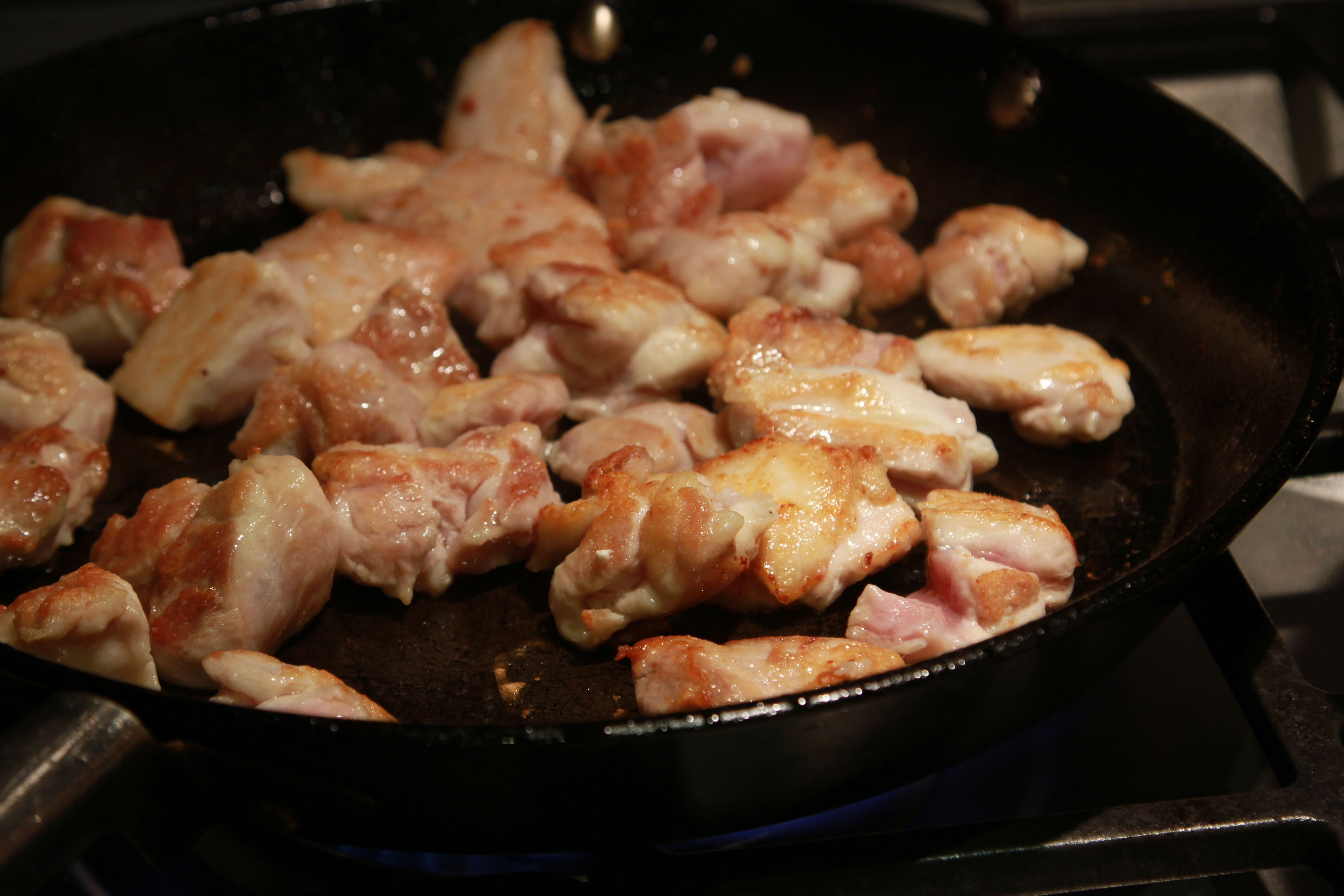 12 chicken thighs, cube each thigh into 4 pieces (unless they are really big, then make 6 pieces from it). Stir in 2 tablespoons full of seasoned plain flour to your bowl of chicken pieces.