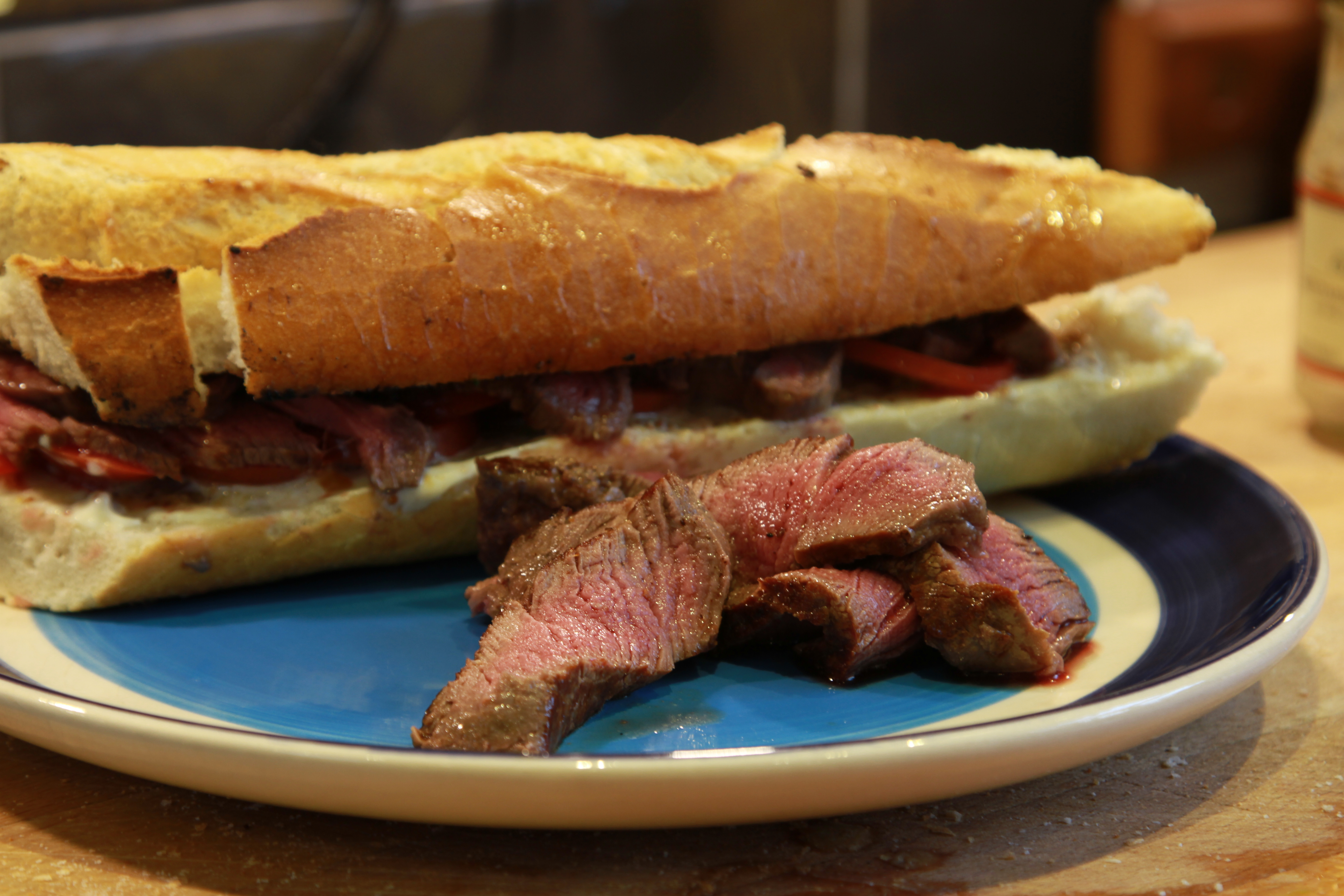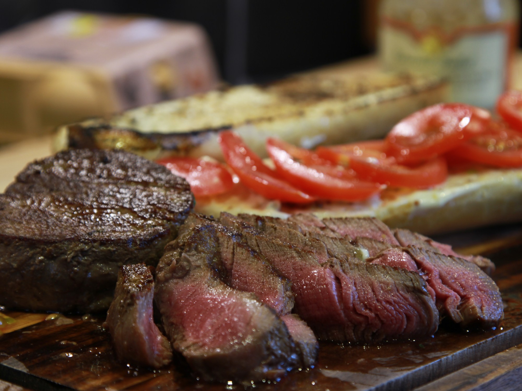 Slice the steak into strips. Use the un-mayonnaised side of bread to mop up any juices that have come out of the rested and sliced fillet.