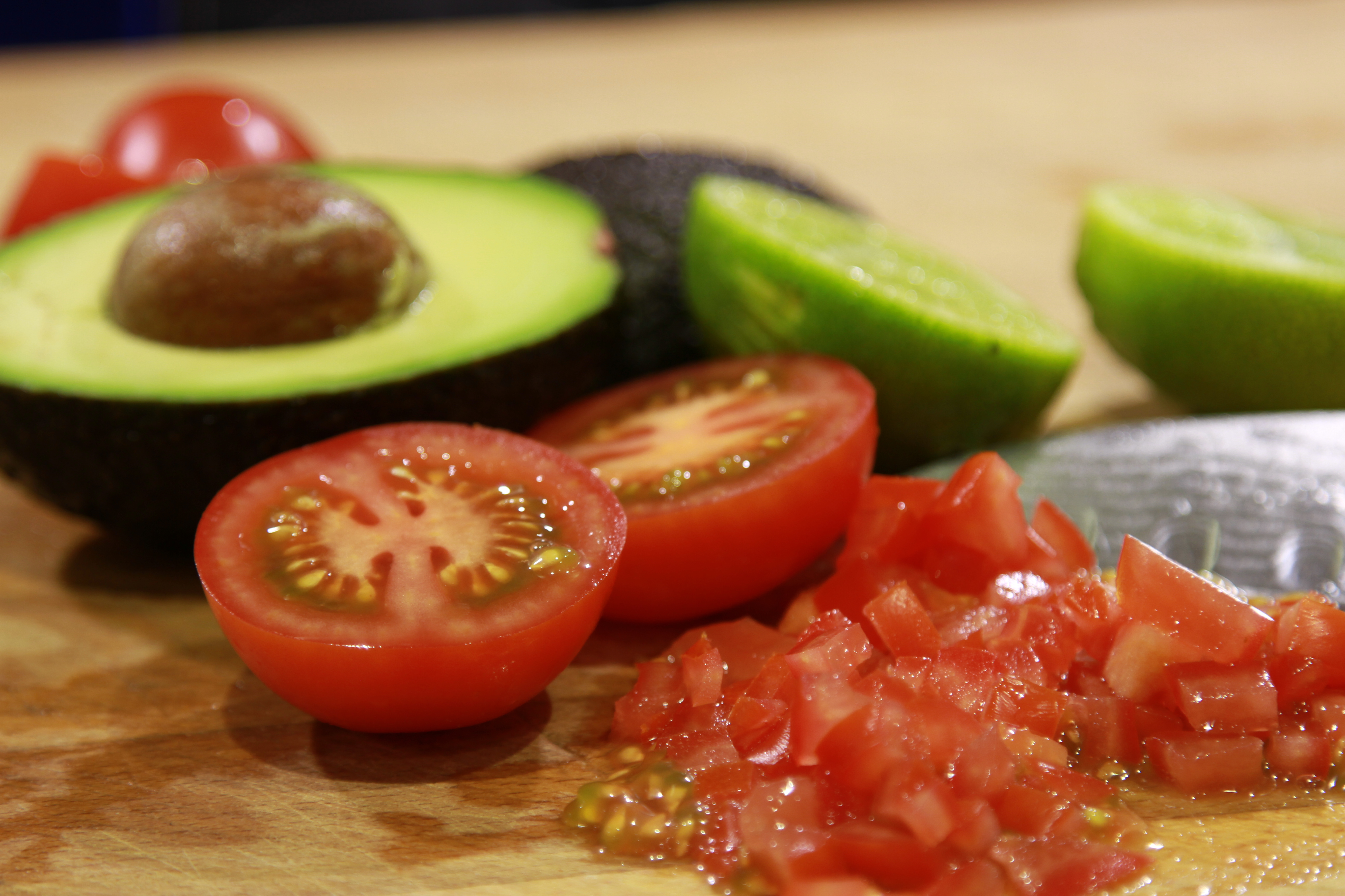 Finely dice the tomatoes and add to the avocado in a bowl, mix well with some salt, pepper, olive oil and the juice of half the lime. Stir well and cover and keep in the fridge until you need it.