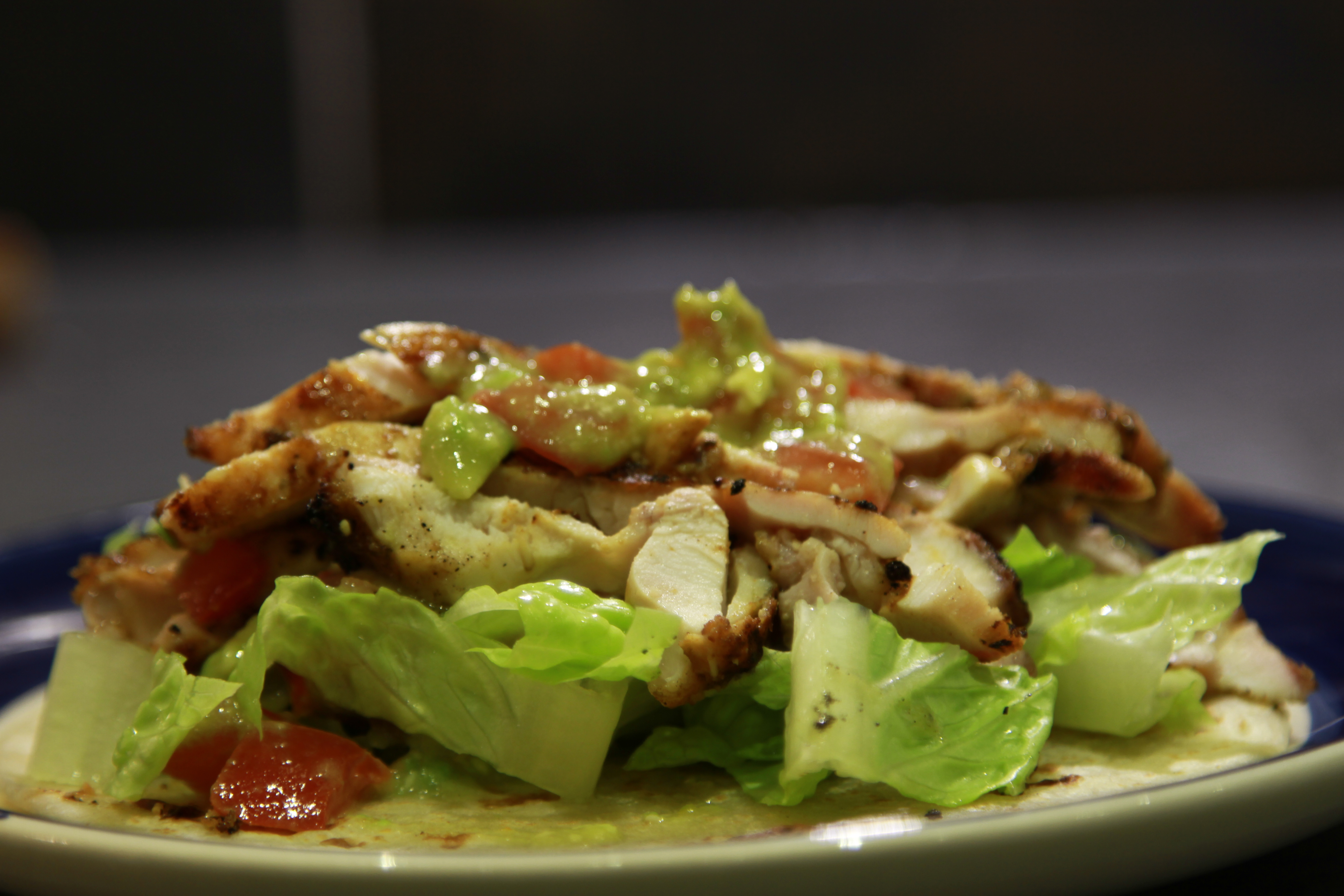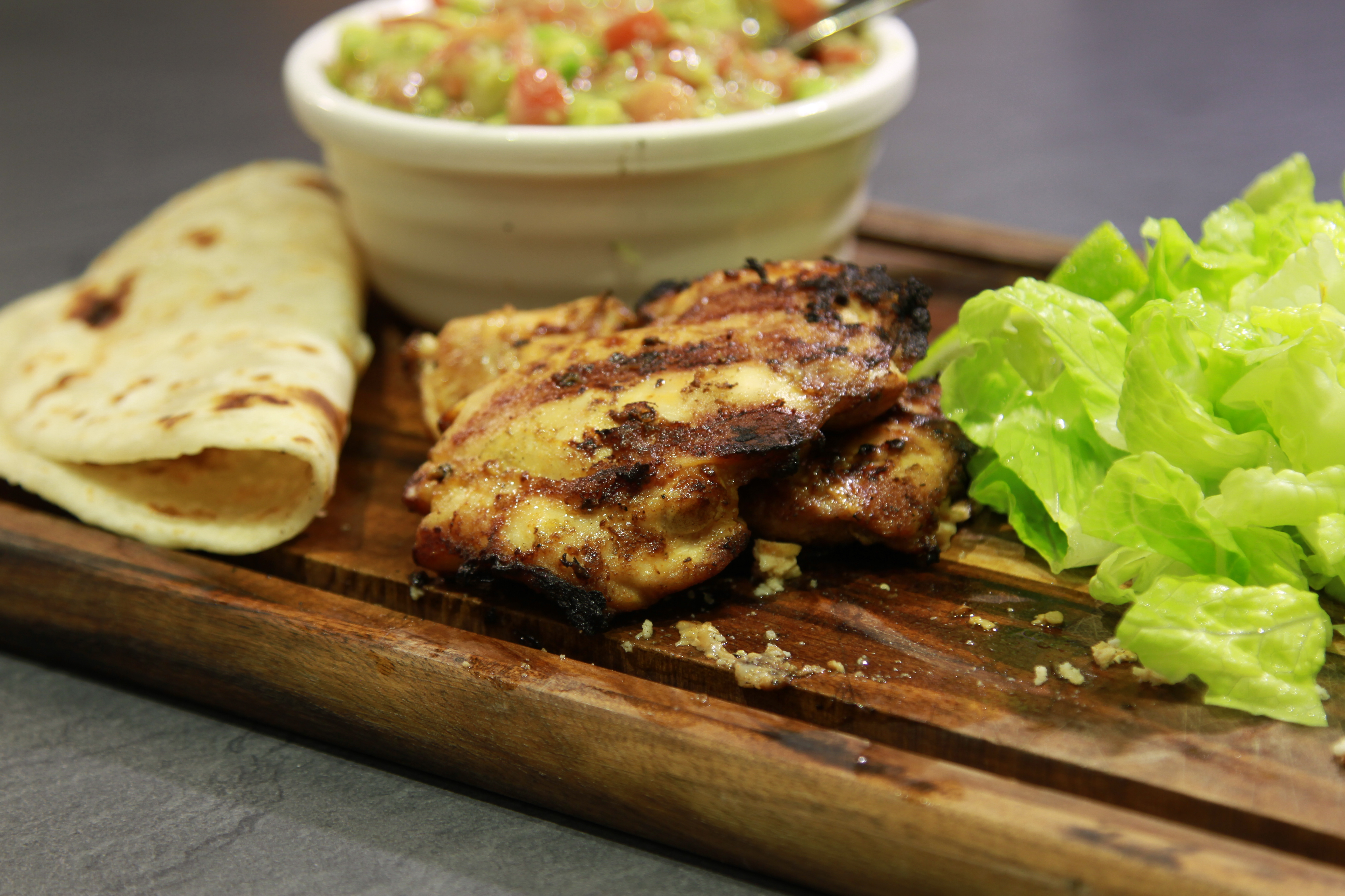 Place a dollop and smear the guacamole onto a roti; load with chicken and top with some lettuce. Roll and enjoy!