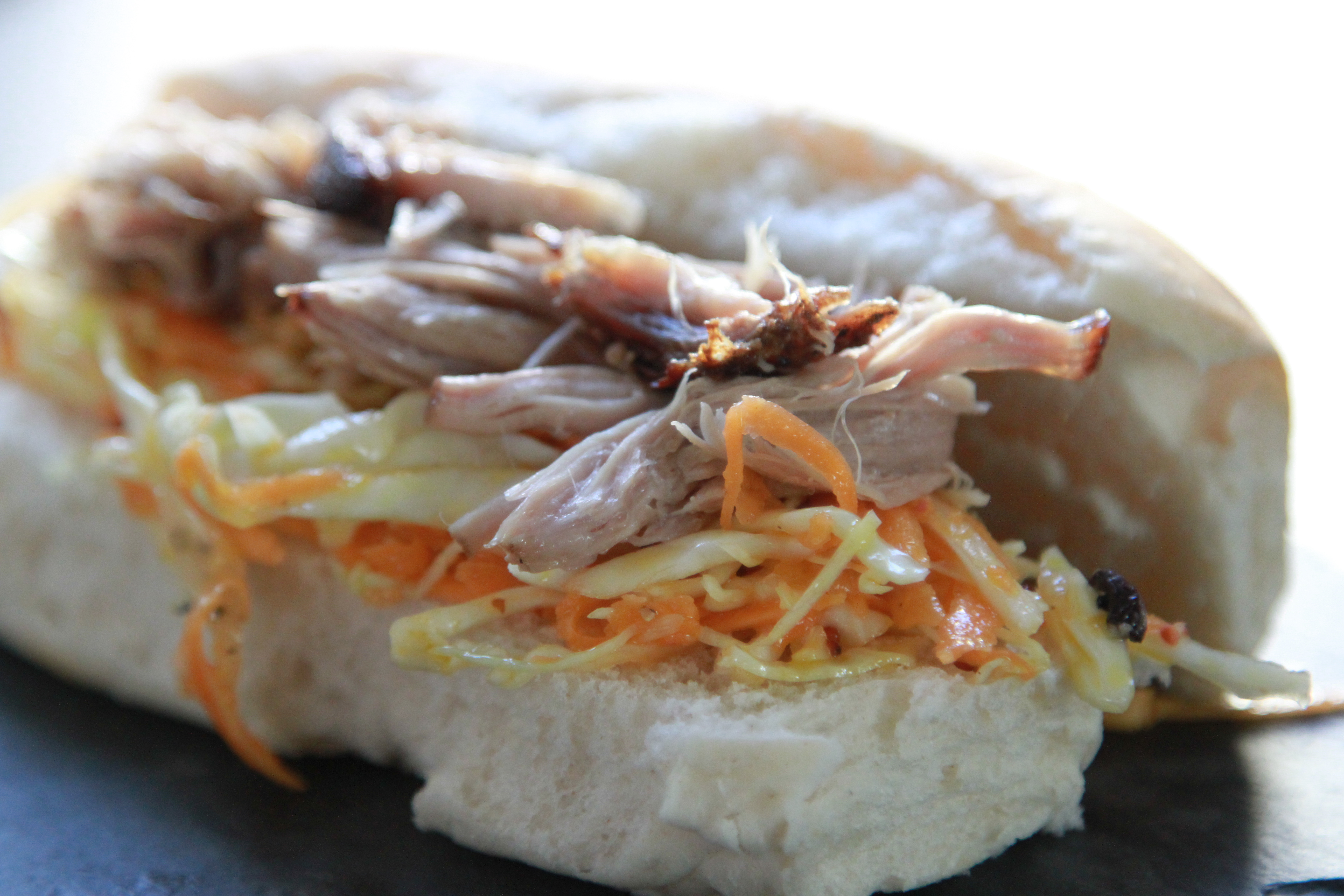 I served this in soft white rolls with a homemade coleslaw. The meat, although meltingly tender and falling apart was a tiny bit dry in the parts that didn’t have too much fat around. I think that’s why pulled pork nearly always is served with a sauce of some description.