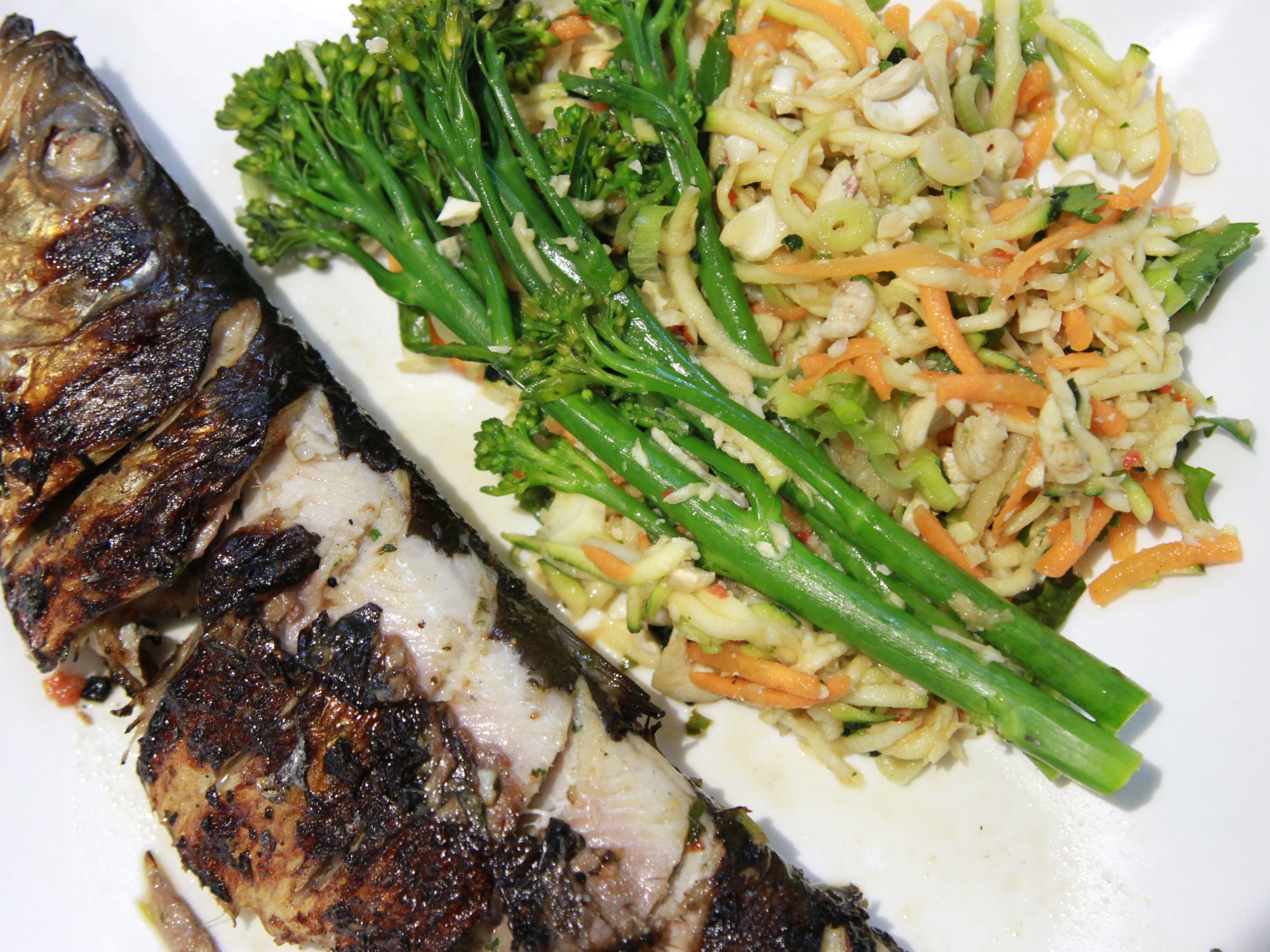 This works with any oily fish like sardines, mackerel or even trout. The dressing is made simply by blending all the ingredients in a food processor and then after a short marinade, grilling the fish on a hot barbecue, under a hot grill should have much the same effect. I serve it with my fast Thai salad.