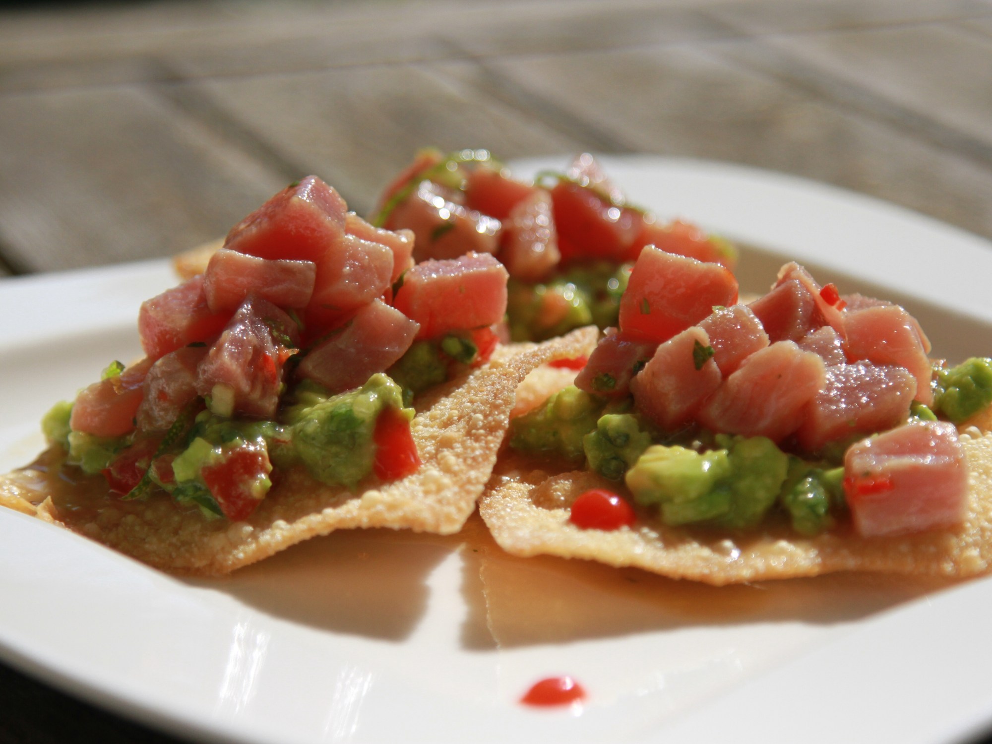 To serve, spread a little guacamole on a tostada, top with a couple of spoons of the Tuna and a little sprinkle of the cucumber cubes.