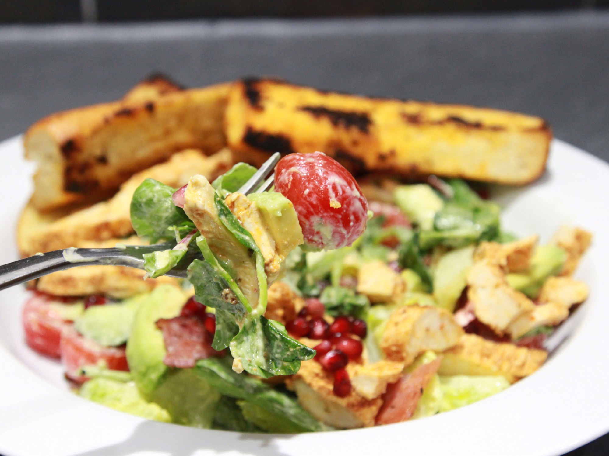 Slice the chicken breast into strips and finely chop the bacon into small bits mix them both into the salad and add as much of the dressing as you want, mix well. Sprinkle over the pomegranate. Serve with the garlic bread.