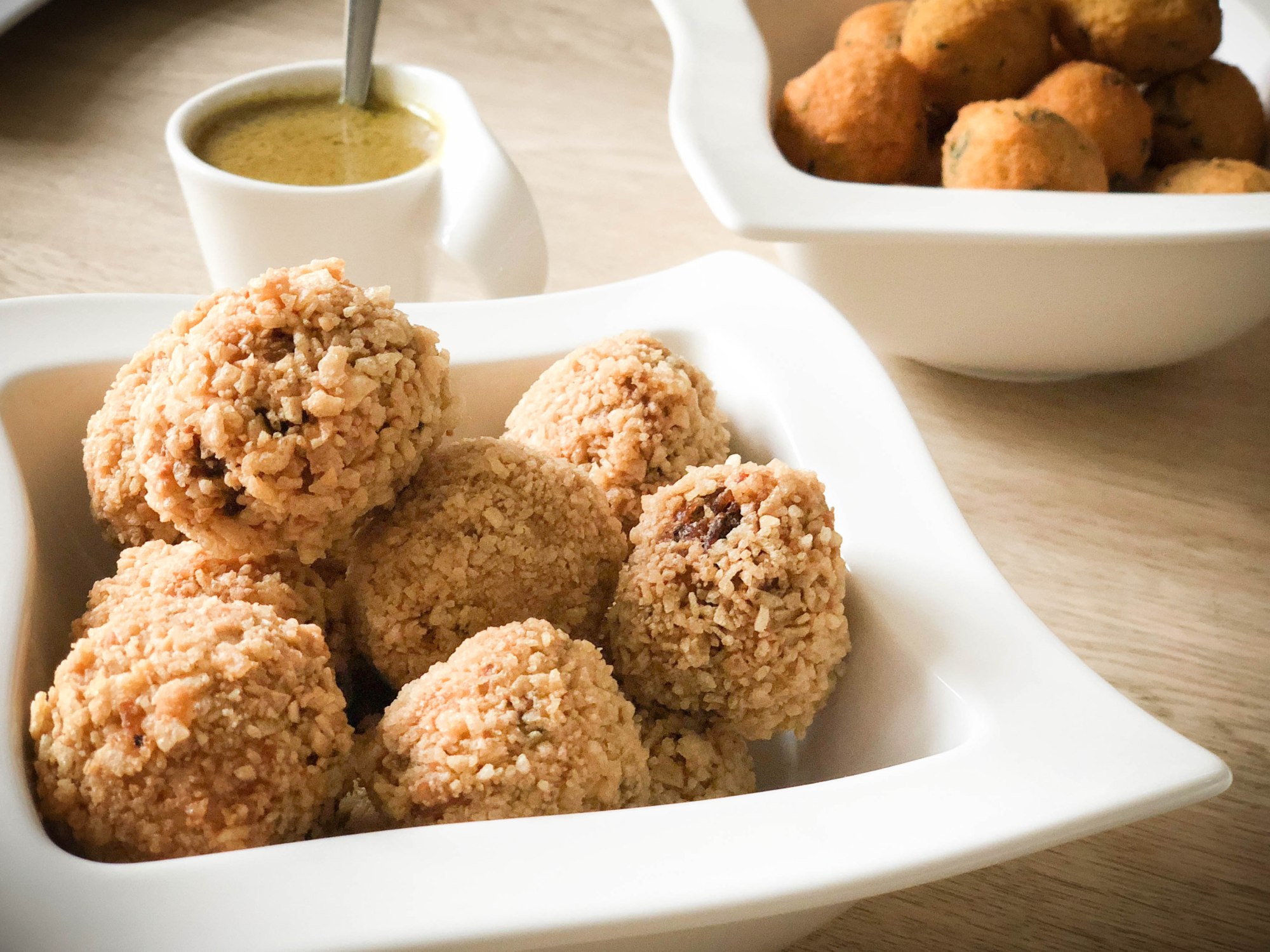 When you are ready to cook. Heat a few inches of sunflower oil to about 180c and fry the balls a few at a time until golden and crisp. You can place the balls on an oven tray and keep them warm in an oven set to about 70c until all the balls are fried.