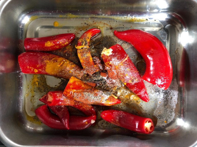 Place all the ingredients in a baking dish and roast for about 10-15mins at about 180-200c until the chilli are beginning to char but don’t let the garlic burn.
