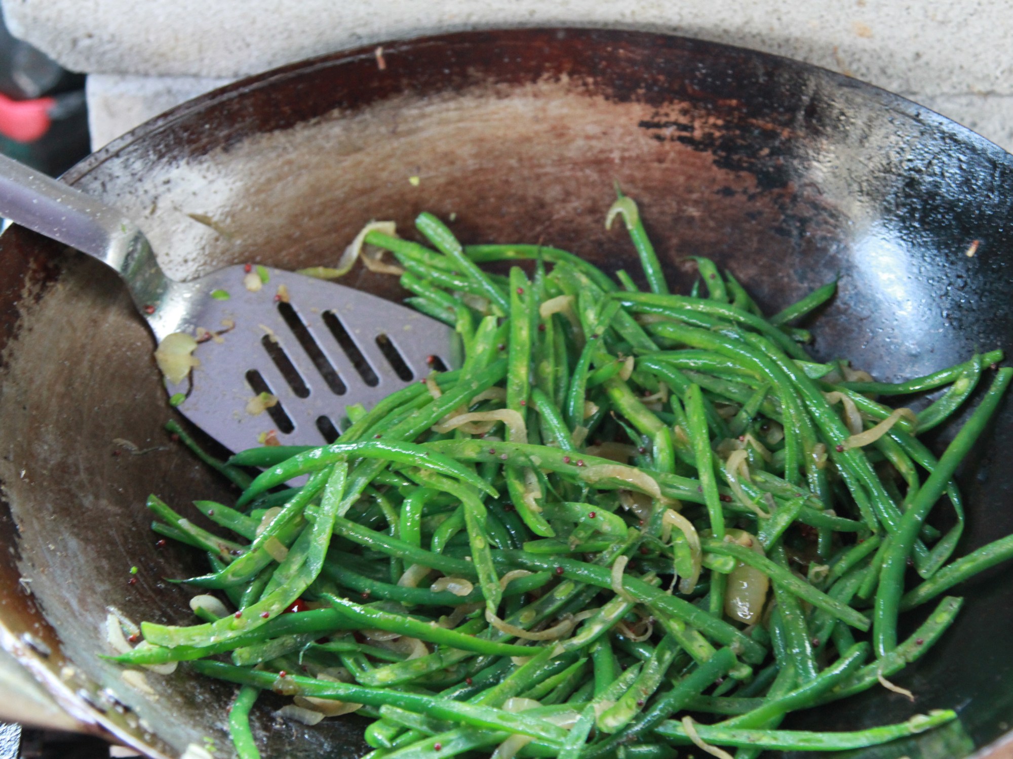 In a wok or large pan, fry the onion, garlic and ginger until soft but not brown. Add the chilli and the mustard seeds. The seeds will begin to pop and spilt after a minute or so; at this point throw in the beans and turn the heat up. Toss the beans about in the onion, garlic and ginger. Add a a small splash of water to allow the steam produced to help soften the beans a little. If you are using a wok on a high heat, you can let the beans form a little charring to imbue a smokey note to the finished dish.